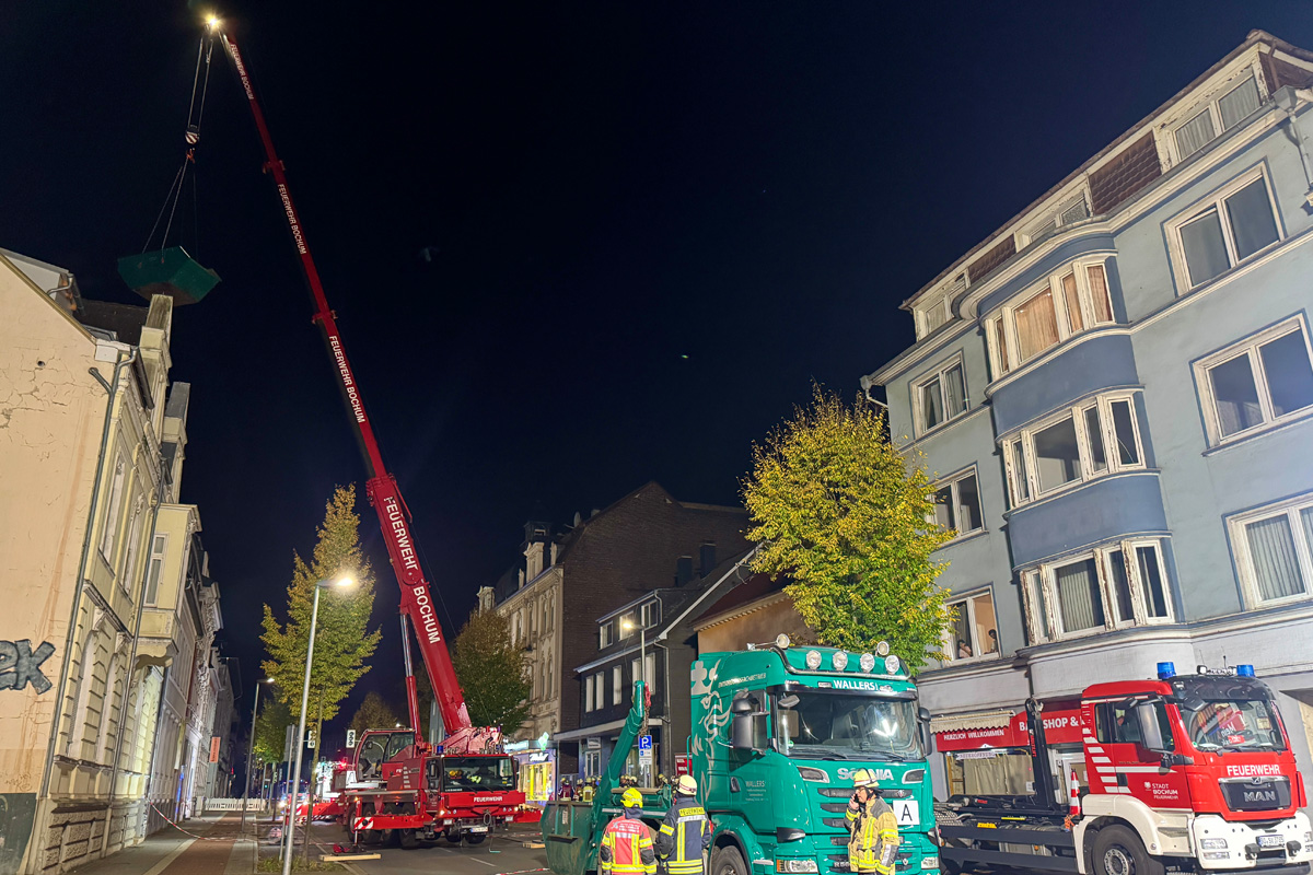 Ein Kran der Feuerwehr Bochum und in Kürze ein Teleskopmast der Feuerwehr Dortmund kommen zum Einsatz. Drohnen des Ennepe-Ruhr-Kreises überwachen die Lage aus der Luft. Das beschädigte Dach wird derzeit schrittweise abgetragen und durch mehrere Fachfirmen entsorgt.