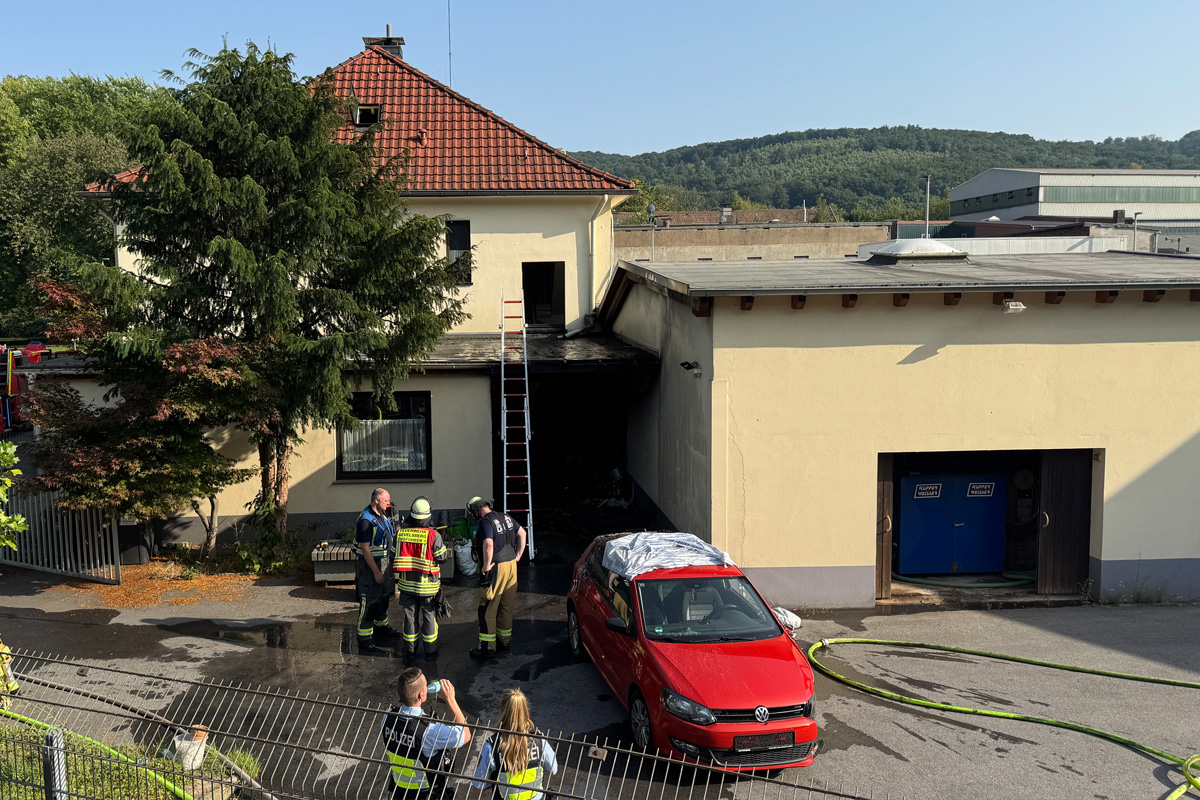 Bereits auf der Anfahrt war aus einem Dachfenster und dem hinteren Gebäudeteil Brandrauch erkennbar.