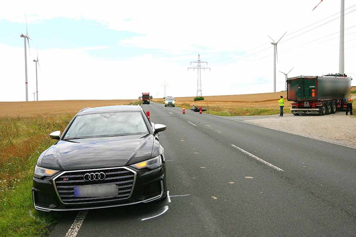 Zu diesem Zeitpunkt überholte die Kolonne ein Audi Kombi, gefolgt von einem Motorrad. Der 41-jährige Audi A6 Fahrer bemerkte den ordnungsgemäß abbiegenden LKW und leitet eine Vollbremsung ein.