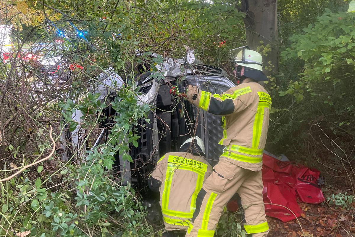 Ein Autofahrer ist am Dienstagmittag, 21.10.2025, in Grevenbroich auf der L116 von der Straße abgekommen und auf die Seite gestürzt. Die Feuerwehr befreite den Mann mit schwerem Gerät aus seinem Fahrzeug. Er kam verletzt ins Krankenhaus.