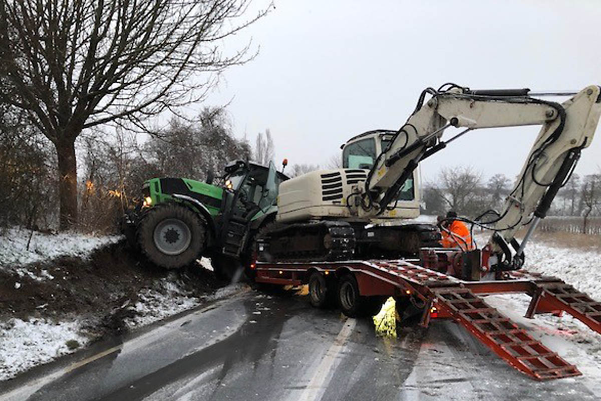 Zurzeit ist die L542 zwischen Großfischlingen und Essingen voll gesperrt. Bei spiegelglatter Fahrbahn kam ein Traktor samt Anhänger, auf welchem ein Bagger geladen war, gegen 17:30 Uhr von der Fahrbahn ab.