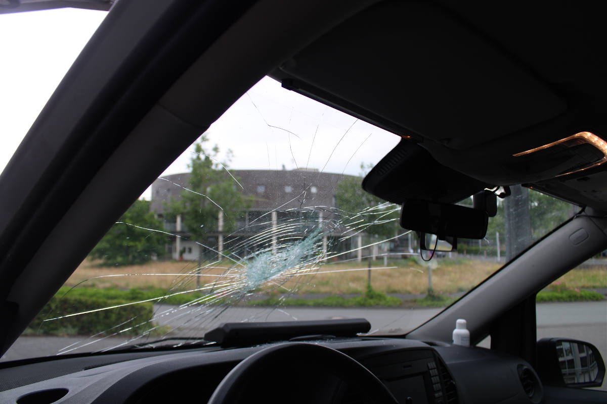 Unvermittelt nahm der Mann einen größeren Stein und warf diesen auf die Frontscheibe eines Mercedes Vito Streifenwagens. Der abgeprallte Stein beschädigte in der Folge auch das Dach des Fahrzeugs.