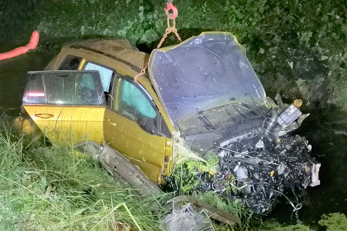 Hier kam der Pkw entgegen der Fahrtrichtung in einem wasserführenden Graben zum Stehen.