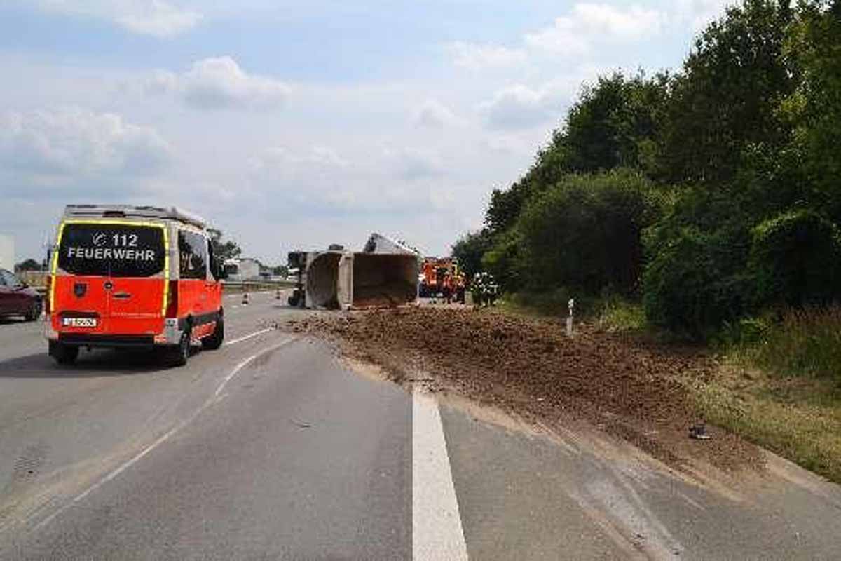 In der Folge kippte der mit Erdaushub beladene Sattelauflieger um und die Ladung verteilte sich auf mehreren Fahrsteifen. Durch den Unfall wurde der Tank des Lkw beschädigt. Eine größere Menge Diesel verteilte sich dadurch auf der Fahrbahn.