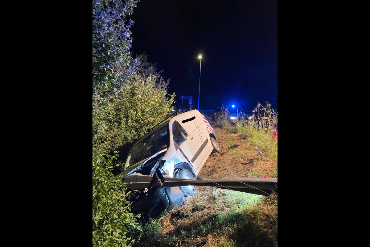 Ein 48-Jähriger Mann aus Hochdorf-Assenheim befuhr mit seinem Fiat Scudo die Holidayparkstraße in Richtung Kreisverkehr. An diesem verlor er die Kontrolle über das Fahrzeug und kam von der Fahrbahn ab. Das Fahrzeug kam seitlich in der Fahrbahnbegrenzung zum Liegen. Hierbei riss er ein Verkehrsschild um und beschädigte den Abschnitt der Schutzplanke erheblich. Der Fahrer konnte sich selbst aus dem Fahrzeug befreien. Er blieb unverletzt.