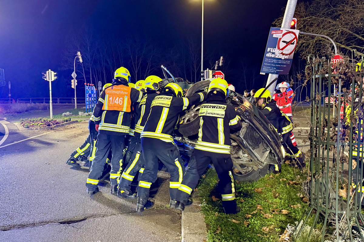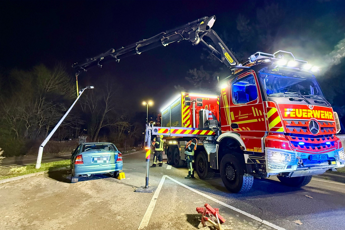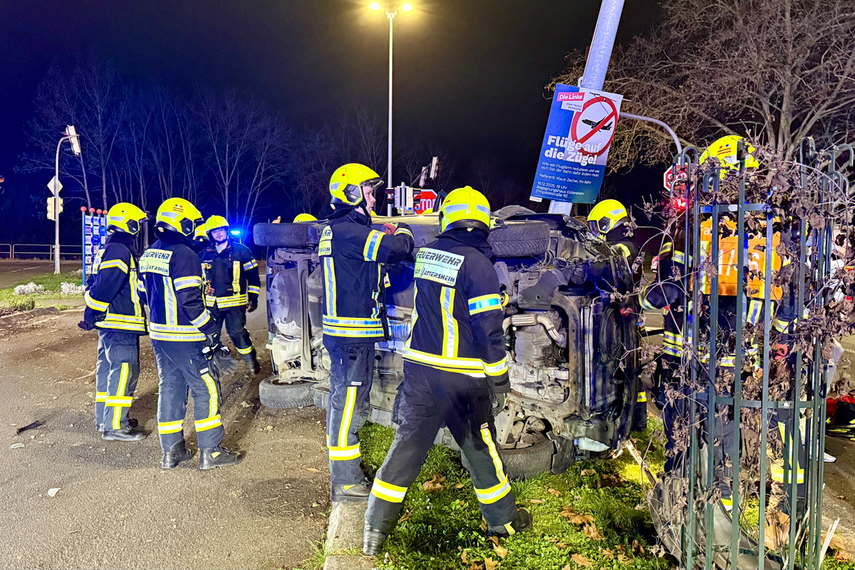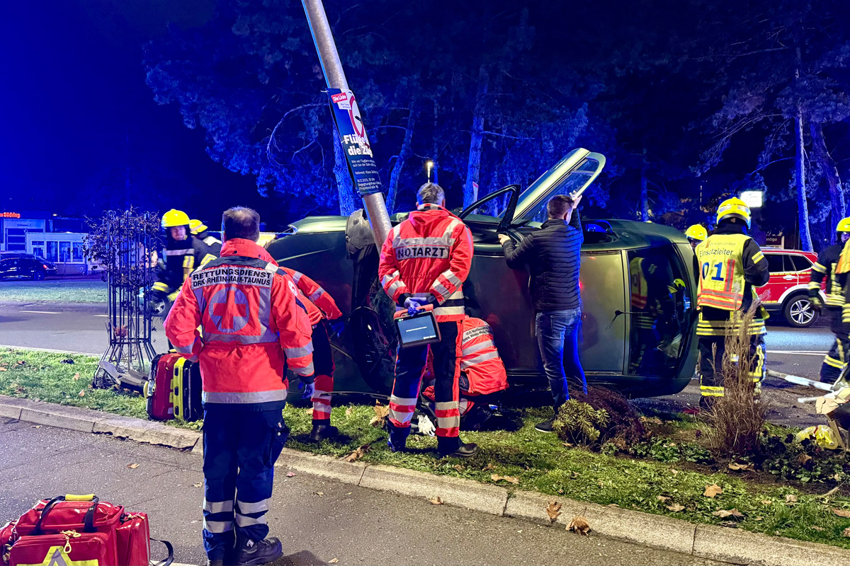 Bei einem Alleinunfall an der Kreuzung Südring/Frankfurter Straße in Hattersheim am Main ist am frühen Abend des 23.12.2025 eine Autofahrerin leicht verletzt worden. Ihr Fahrzeug kippte nach einer Kollision um und prallte gegen einen Laternenmast.