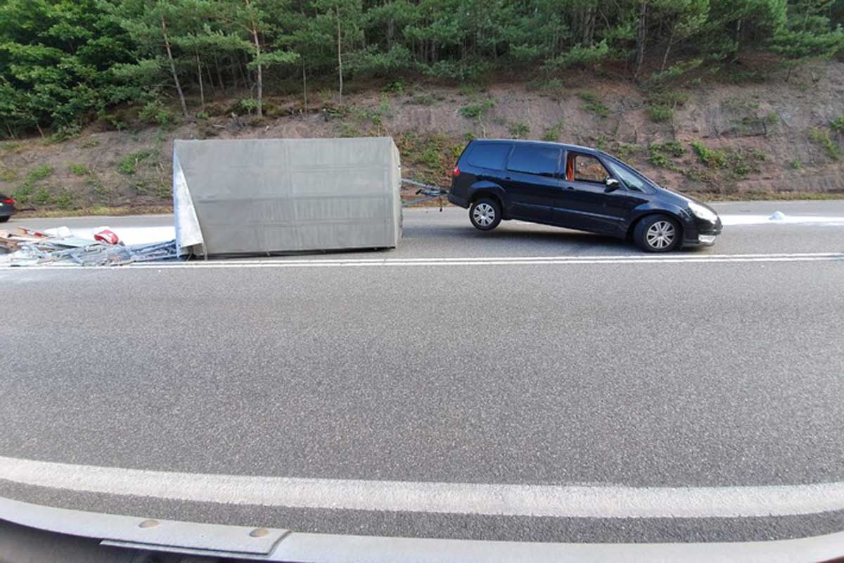 Vermutlich infolge nicht angepasster Geschwindigkeit geriet das Gespann ins Schlingern, der mit Gerüstteilen und Baumaterialen beladene Anhänger kippte auf die Seite, das Gespann drehte sich und blieb auf der Überholspur havariert liegen.