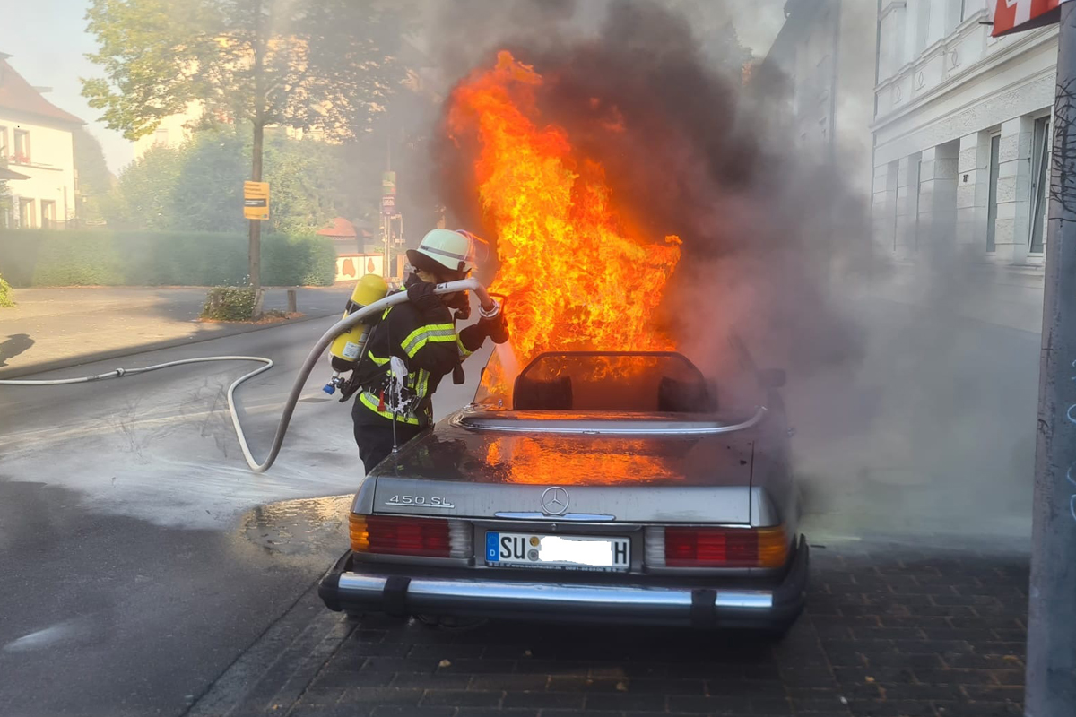 In Hennef geriet am 27.08.2025 ein Mercedes-Benz 450 SL-Cabrio während der Fahrt in Brand. Die 59-jährige Fahrerin konnte sich rechtzeitig in Sicherheit bringen. Trotz des schnellen Eingreifens der Feuerwehr brannte das historische Fahrzeug vollständig aus.