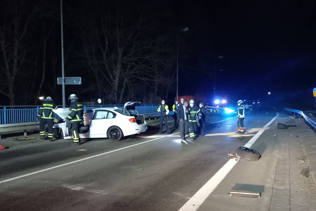 Ein BMW war ohne Beteiligung weiterer Fahrzeuge verunfallt und hatte einen massiven Schildermast sowie Leitplanken getroffen. Durch den Aufprall wurden der Mast und ein Vorderrad des PKWs abgerissen. Der Fahrer hatte sich vor Eintreffen der Feuerwehr selbst befreit und wurde durch die Feuerwehr sowie den später eintreffenden Rettungsdienst versorgt und betreut. Parallel wurde die Einsatzstelle abgesichert und ausgeleuchtet, um auslaufende Betriebsmittel abzustreuen.