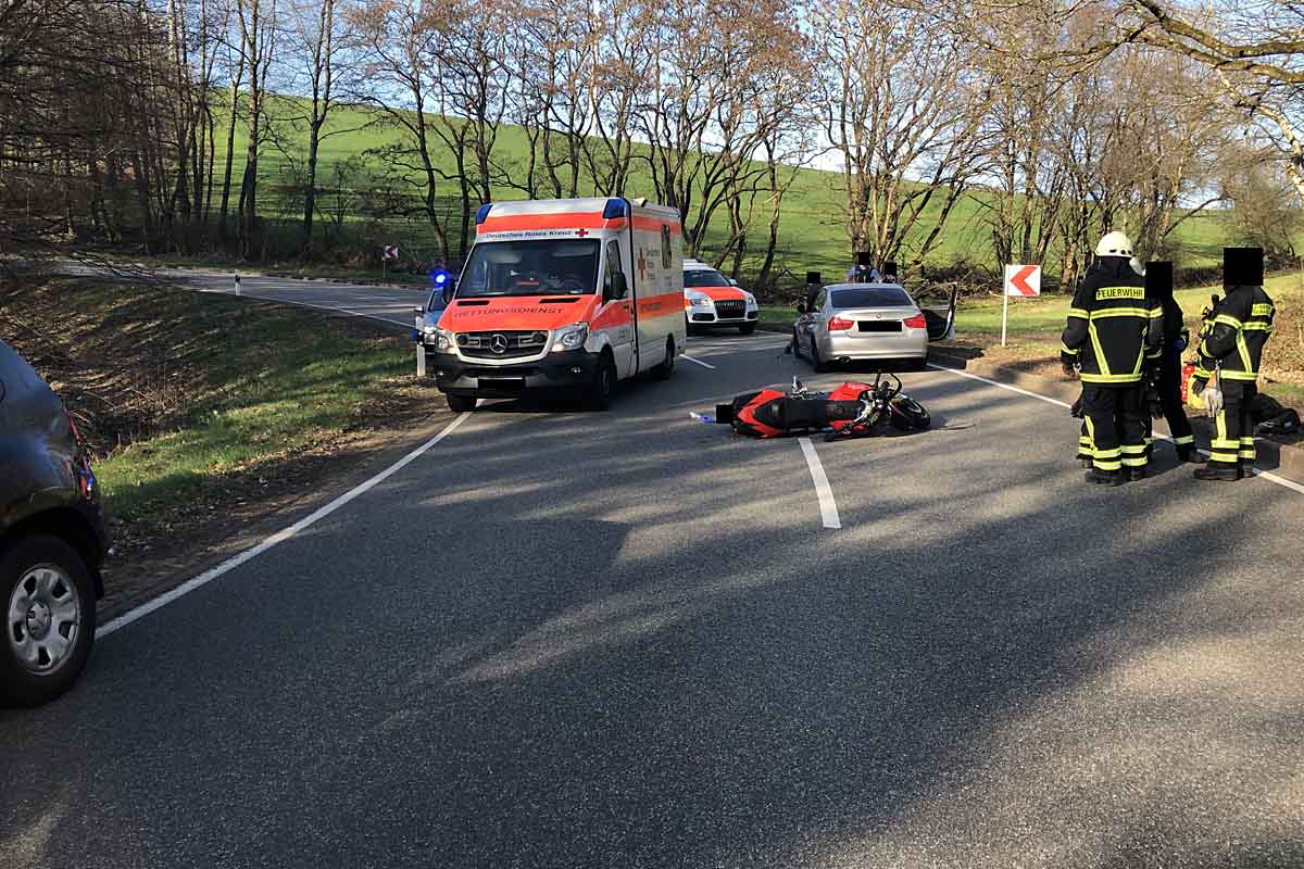 Am 31.03.2021, 17.40 Uhr kam es auf der L 350 zwischen Herschweiler-Pettersheim und Konken zu einem Verkehrsunfall zwischen einem Motorradfahrer und einem Pkw.