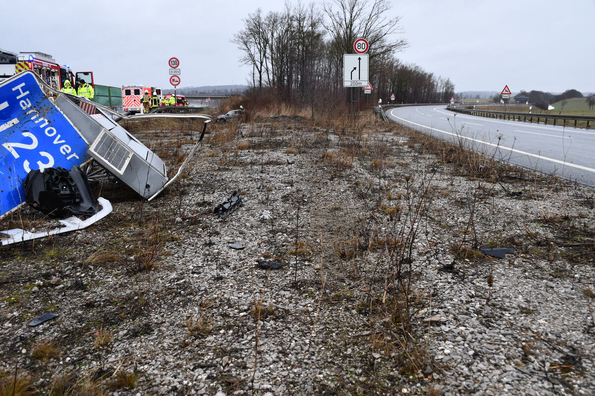 Schließlich landet er im Grünbereich und wird durch die Außenschutzplanke zurück in den Graben abgewiesen. Dies bewahrte den Unfallverursacher vor dem unkontrollierten Schleudern über die beiden Fahrstreifen der A7 und möglichen weiteren Zusammenstößen mit weiteren Verkehrsteilnehmern.