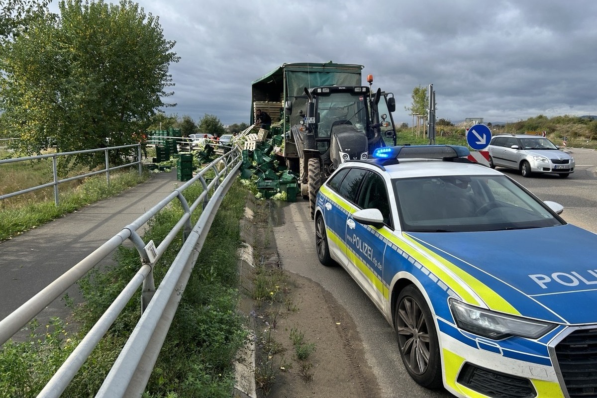 Am 25.09.2024 hat ein Traktorfahrer gegen 10:00 Uhr beim Ausfahren aus dem Kreisverkehr auf der L530 zwischen Hochdorf-Assenheim und Dannstadt-Schauernheim, in Fahrtrichtung Dannstadt-Schauernheim, mehr als 100 Kisten Salat und Sellerie verloren.