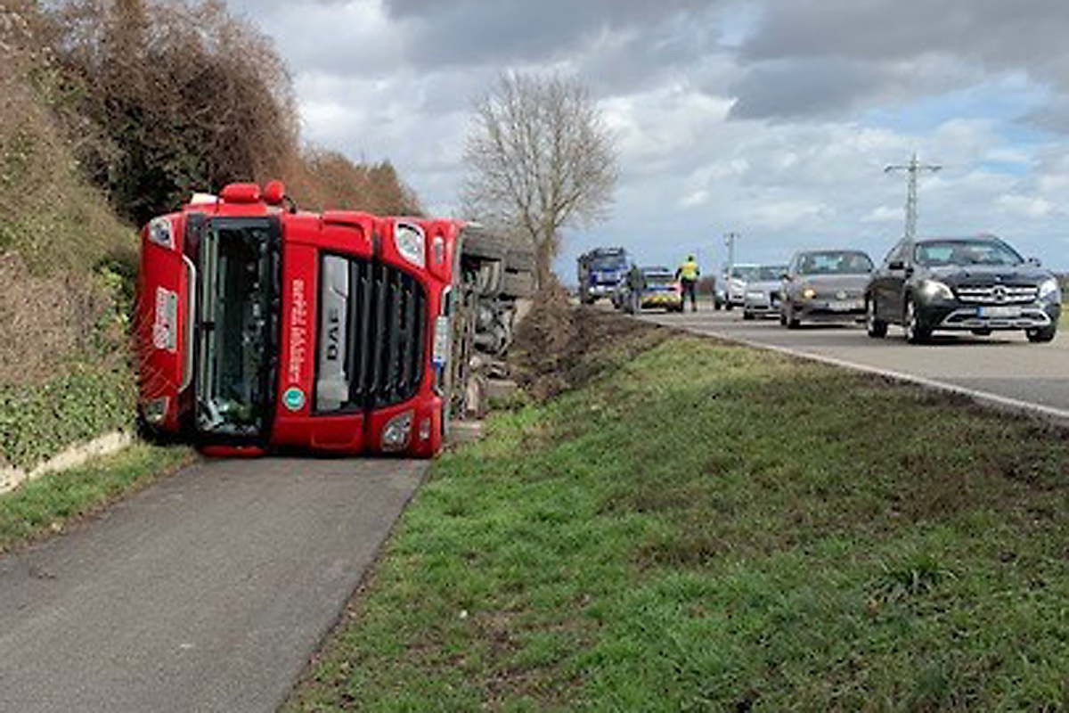 Der Sattelzug, beladen mit 11 Tonnen Reifen, kippte zur rechten Seite um und kam auf dem angrenzenden Radweg zum Liegen. Der Fahrer blieb unverletzt und konnte sich selbstständig aus seinem Fahrzeug befreien.
