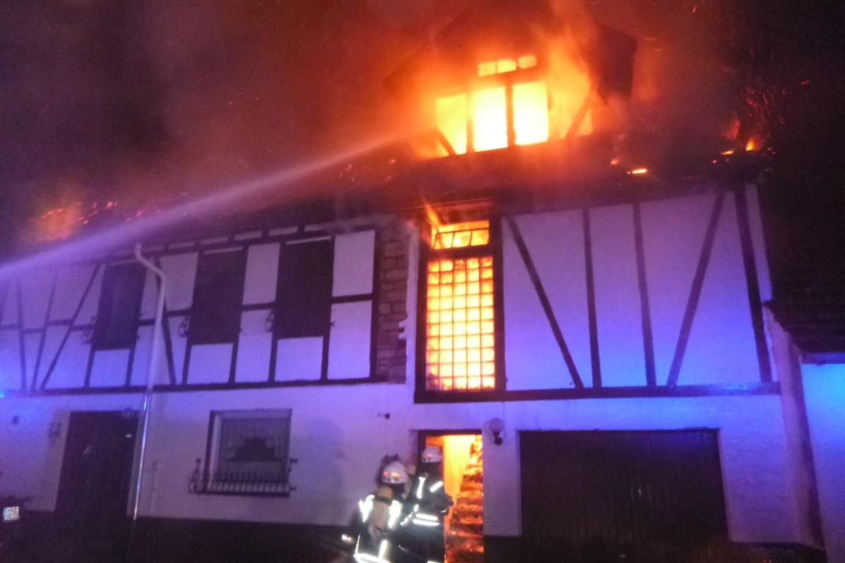 Bei Eintreffen der Einsatzkräfte steht das Obergeschoß des Zweiparteienhauses bereits voll in Flammen.