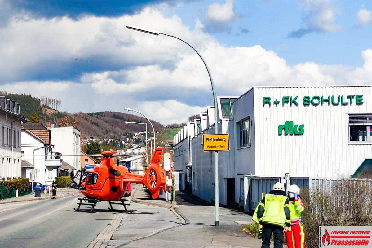 Aufgrund der Schwere der Verletzungen entschieden sich die Rettungskräfte vor Ort, einen Rettungshubschrauber für einen zügigen Transport in eine Spezialklinik hinzuzurufen (Bildquelle: Feuerwehr Plettenberg)