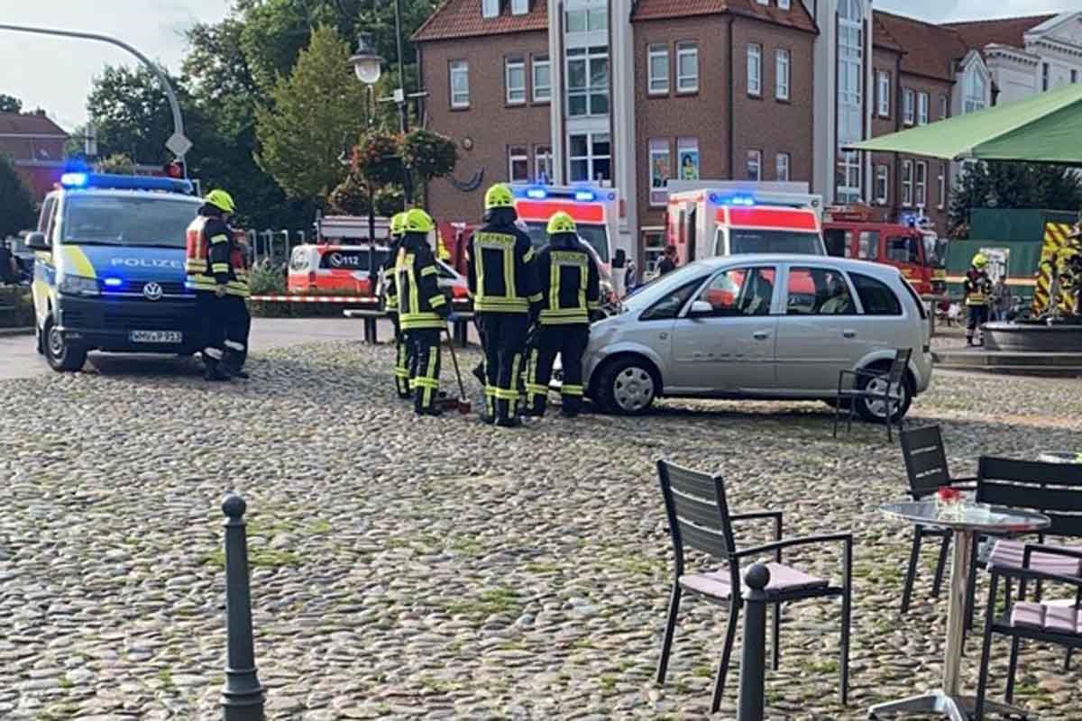 Am 12.09.2021, gegen 17.00 Uhr, fuhr aus bislang unbekannter Ursache der 92-jährige Fahrer eines Pkw aus der Parklücke vor einer Eisdiele vorwärts mit seinem Automatikfahrzeug über den Außenbereich der Gastronomie und kam vor dem Sagenbrunnen zum Stehen.