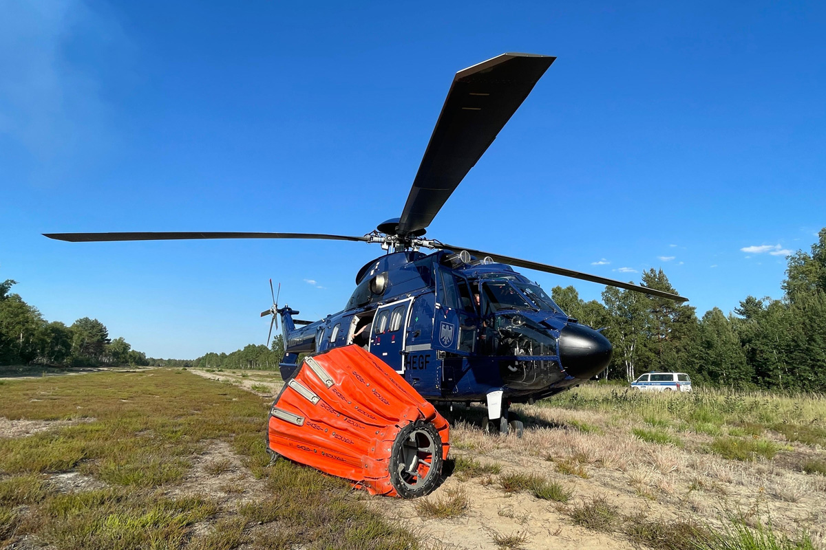 Aufgrund der Munitionsbelastung auf dem ehemaligen Truppenübungsplatz bei Jüterbog unterstützte der Flugdienst der Bundespolizei die einsatzführende Feuerwehr mit einem mittleren Transporthubschrauber vom Typ „Super Puma“ bei der Brandbekämpfung aus der Luft.