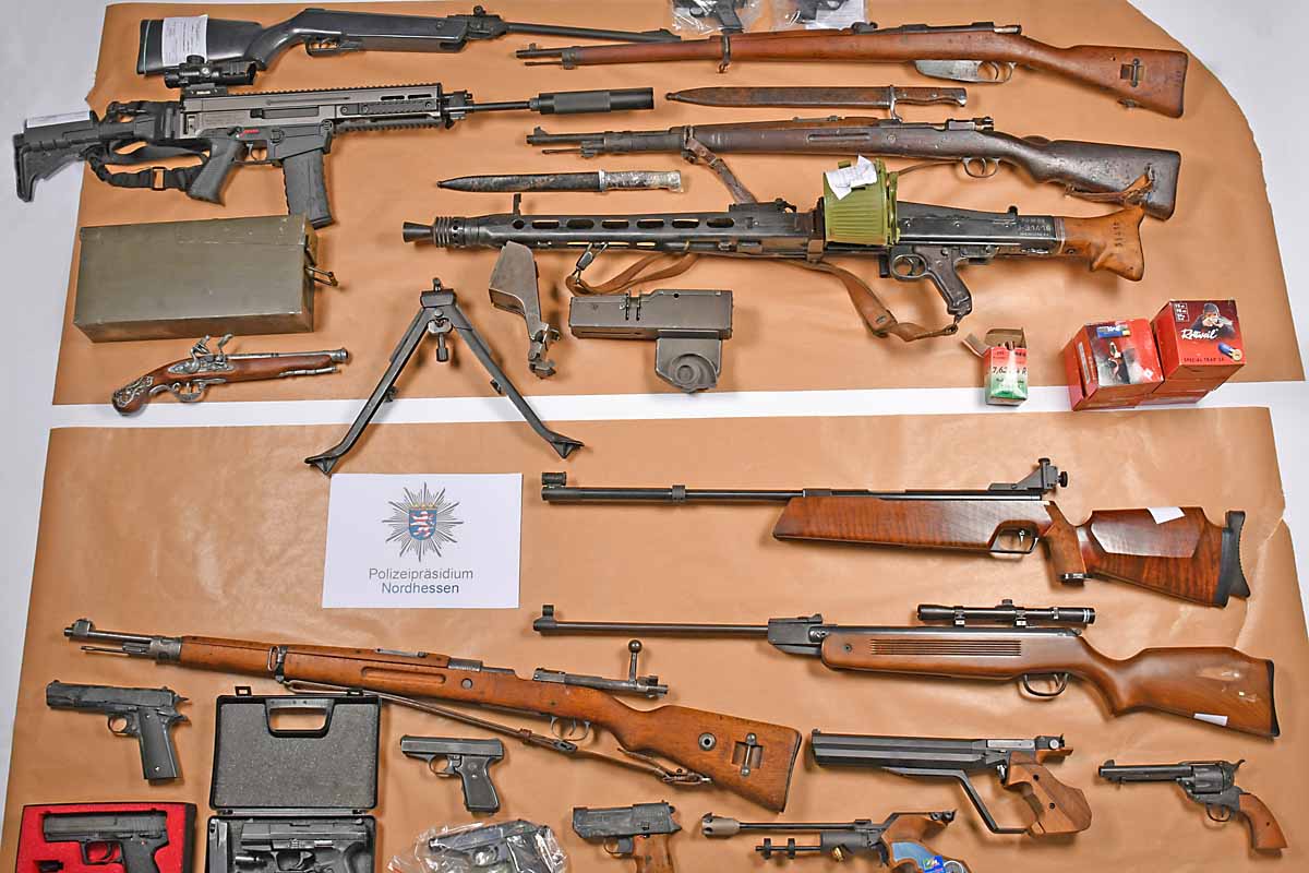 Am Mittwoch der vergangenen Woche schlugen die Ermittler nun in einer aufwendig geplanten, größeren Aktion mit zahlreichen Einsatzkräften zu. Sie konnten bei Festnahmen und Durchsuchungen im Schwalm-Eder-Kreis über 20 Waffen, von scharfen Schusswaffen über Schreckschuss- und Dekorationswaffen bis hin zu Messern, Dolchen und Waffenzubehör (siehe Foto) sowie zwei sogenannte Reichsbürgerausweise sicherstellen.