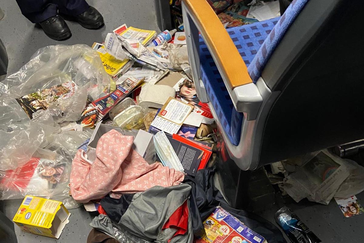 Die eingesetzten Beamten konnten den Mann im Zug leicht erkennen, da dieser in der Zwischenzeit seinen Unmut freien Lauf gelassen hatte und seinen mitgeführten Hausrat in der Bahn verteilte.