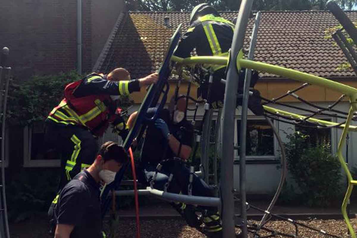Am 10.06.2021 wurde die Feuerwehr Langenfeld unter dem Stichwort "Personenrettung - Kind hängt in Klettergerüst fest" zu einem nicht alltäglichen Einsatz zu einer Schule auf den Fahlerweg alarmiert.