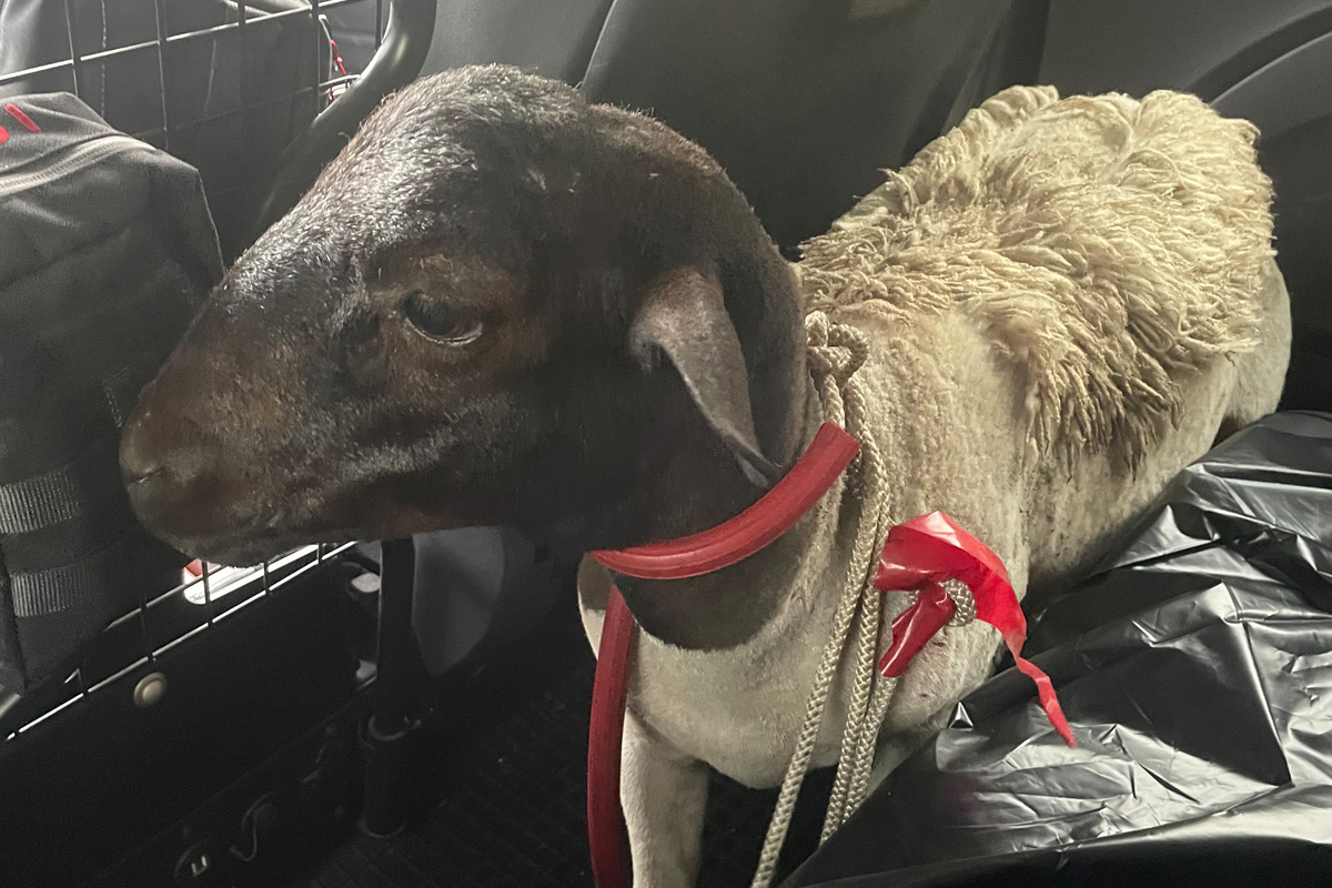 Das Schaf ruht sich nach dem Strapazen im Polizeiauto aus. (Bildquelle: Polizei Köln)
