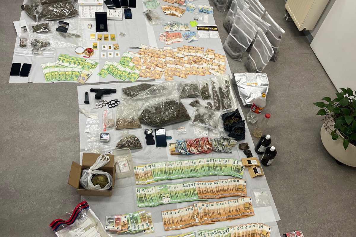 Eine Wohnungsdurchsuchung in Hürth mit Zollhund förderte Cannabis, Haschisch, Bargeld, Schmuck und Gold zutage. Zwei weitere Wohnungen im familiären Umfeld lieferten zusätzliche Betäubungsmittel, über 40.000 Euro Bargeld, halluzinogene Pilze, eine PTB-Waffe mit Magazin und Schlagringe.
