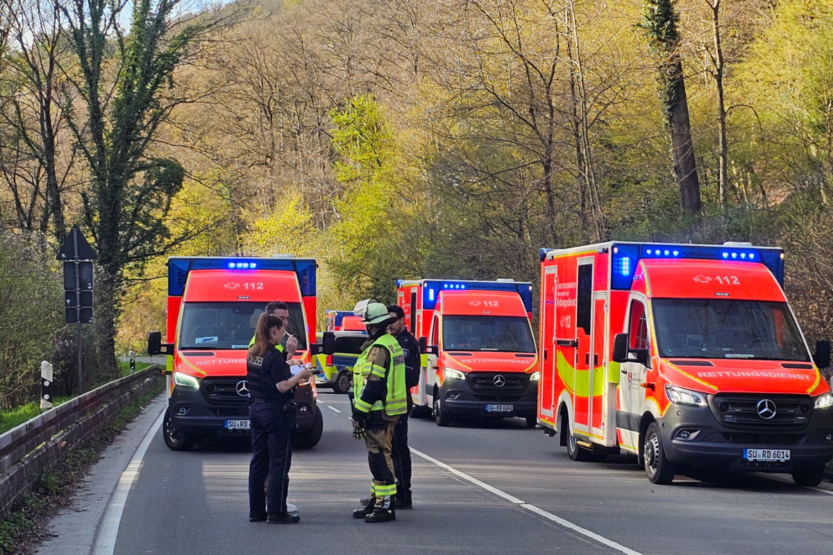 Bei einem Verkehrsunfall auf der L331 bei Königswinter (NW) sind am Ostermontag, 05.04.2026, vier Menschen verletzt worden, drei davon schwer. Ein beteiligtes Fahrzeug fuhr nach dem Zusammenstoß noch mehrere hundert Meter weiter. Auch ein Hund wurde verletzt.