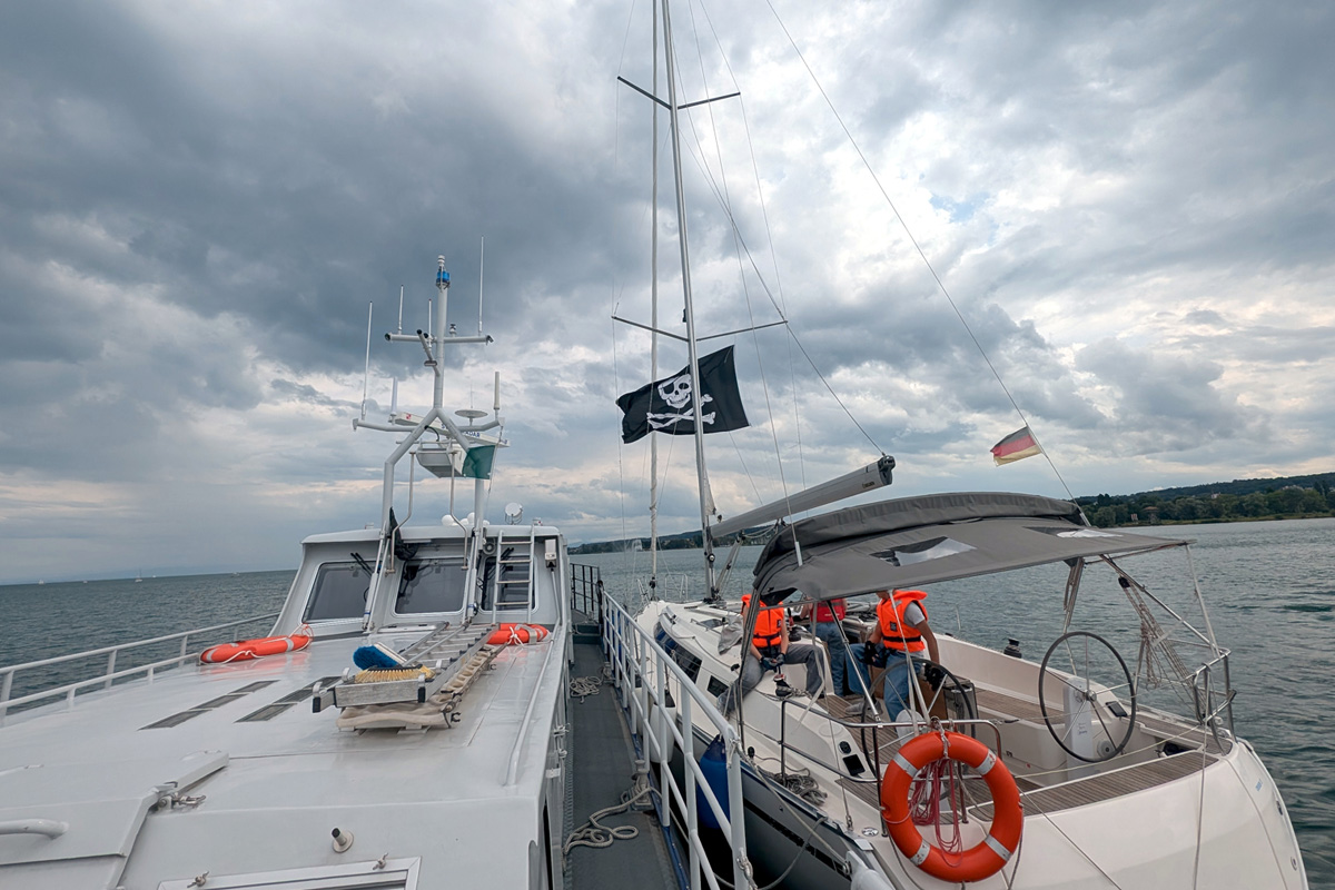 Die Besatzung des Zollboots Haltnau reagierte umgehend und nahm die Segeljacht längsseits in Schlepp.