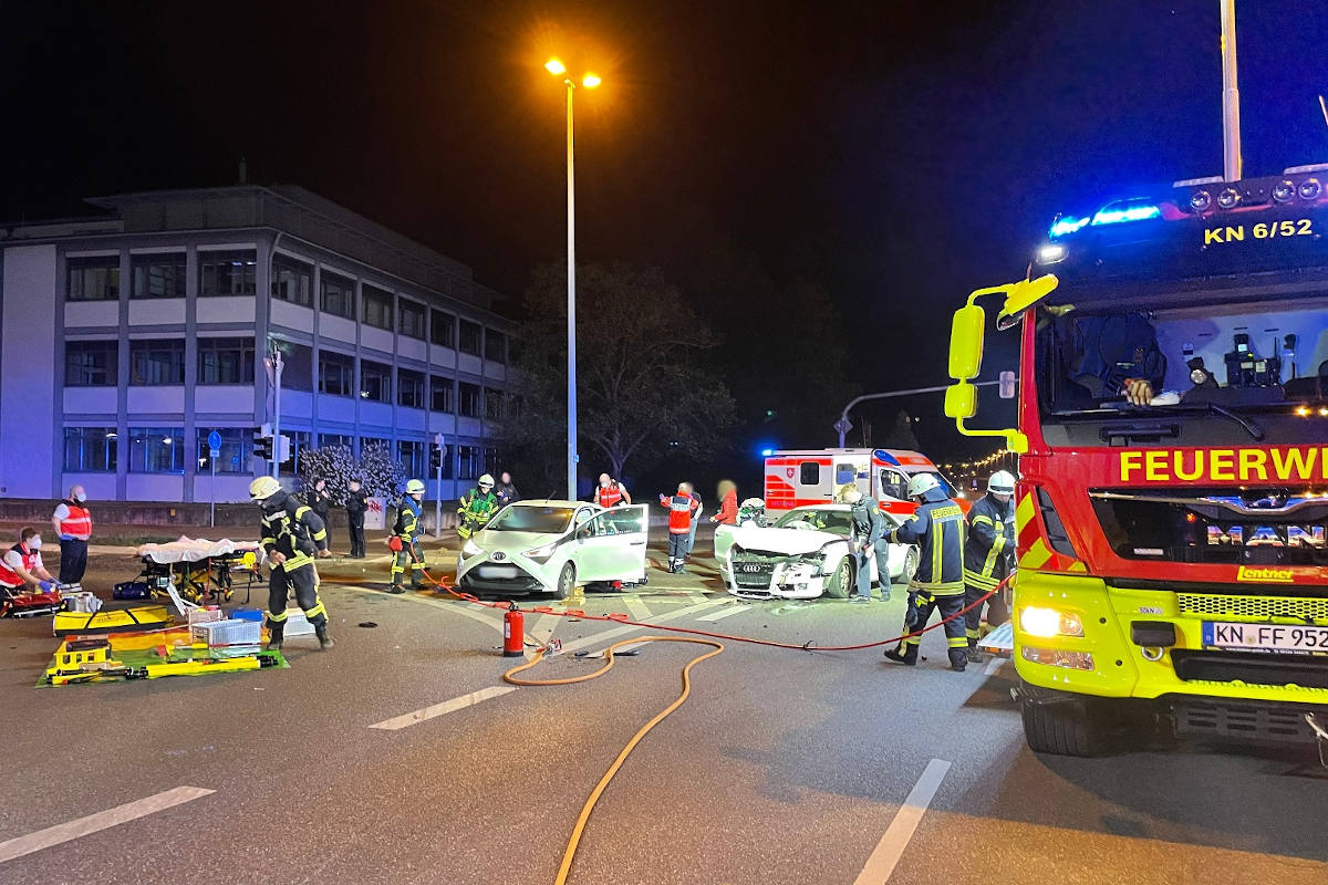 Am 23.04.2022 um 22:27 Uhr ereignete sich auf der Reichenaustraße, Kreuzung Opelstraße, ein Verkehrsunfall mit zwei Fahrzeugen. Dabei wurden zwei Personen in einem PKW eingeklemmt.