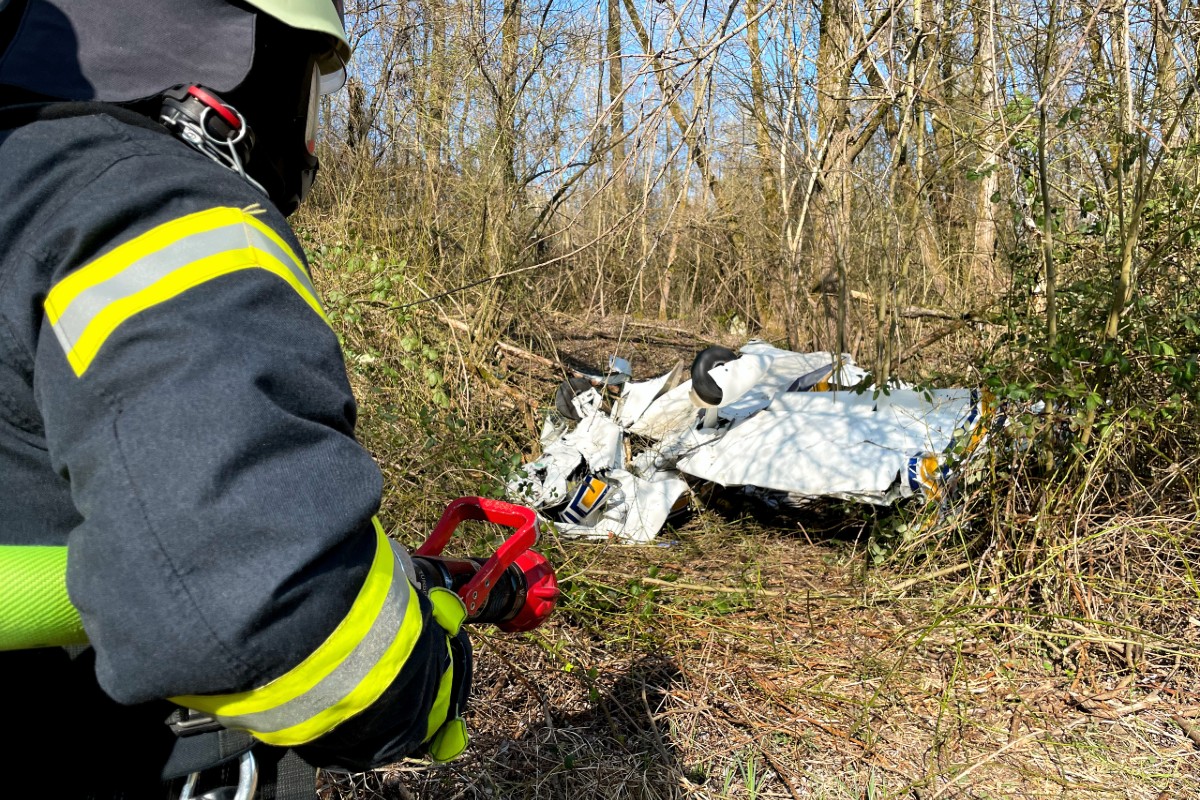 Vor Ort konnte das verunglückte einmotorige Kleinflugzeug, welches mit zwei Personen besetzt war, ca. 200m im Naturschutzgebiet aufgefunden werden. Das verunfallte Kleinflugzeug lag beim Eintreffen der ersten Kräfte auf dem Dach und war deformiert. Mittels hydraulischem Gerät und weiterem Werkzeug konnten die beiden eingeschlossenen Personen aus dem Flugzeugwrack befreit werden. Nach der Versorgung durch den Rettungsdienst unterstützte die Feuerwehr die Rettung aus dem unwegsamen Gelände. Aufgrund von auslaufendem Kerosin wurde ein umfangreicher Löschangriff mit Wasser, Schaum und Pulver vorbereitet.