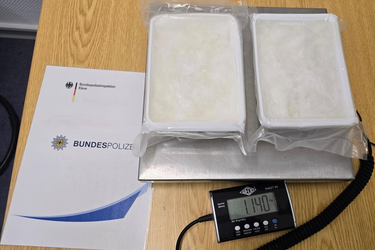 In der Dienststelle ergab eine Wiegung ein Gesamtgewicht von 1.140 Gramm — Methamphetamin. Der Mann wurde vorläufig festgenommen und zur Bundespolizeiinspektion nach Kleve gebracht.