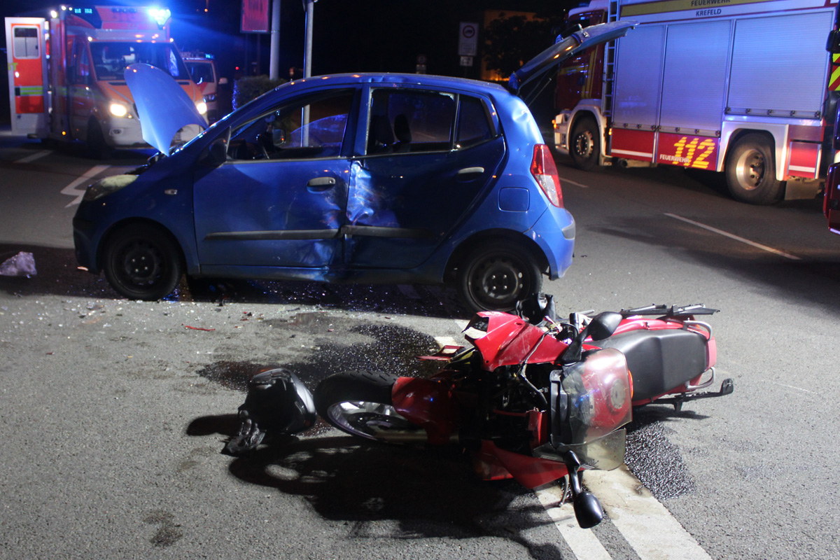 Ein Pkw und ein Motorrad kollidierten bei dem Unfall. (Bildquelle: Polizeipräsidium Krefeld)