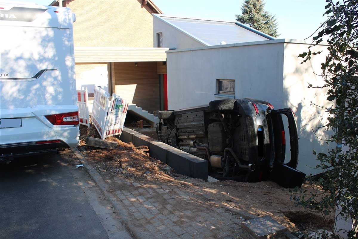 Die 30-Jährige sowie ihr 37 Jahre alte Beifahrer samt Hund konnten das Auto über die Fahrerseite in Kreuzau verlassen (Bildquelle: Polizei Düren)