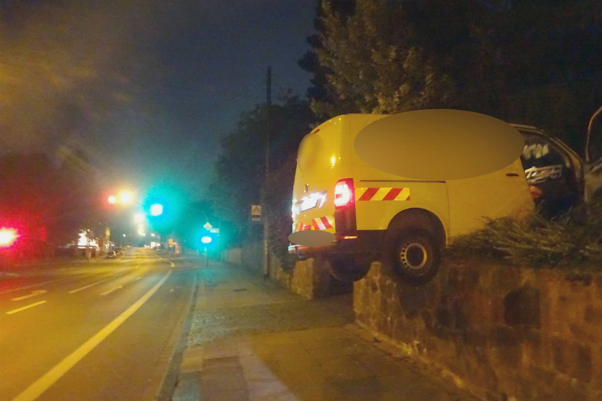 "Wieso hängt da ein Transporter über der Mauer?" Diese Frage werden sich die Beamten vor Ort sicherlich gestellt haben. Oben auf einer 140 cm hohen Mauer "hängt" ein Kleintransporter mit der hinteren Fahrzeughälfte in der "Luft" zur Straße.
