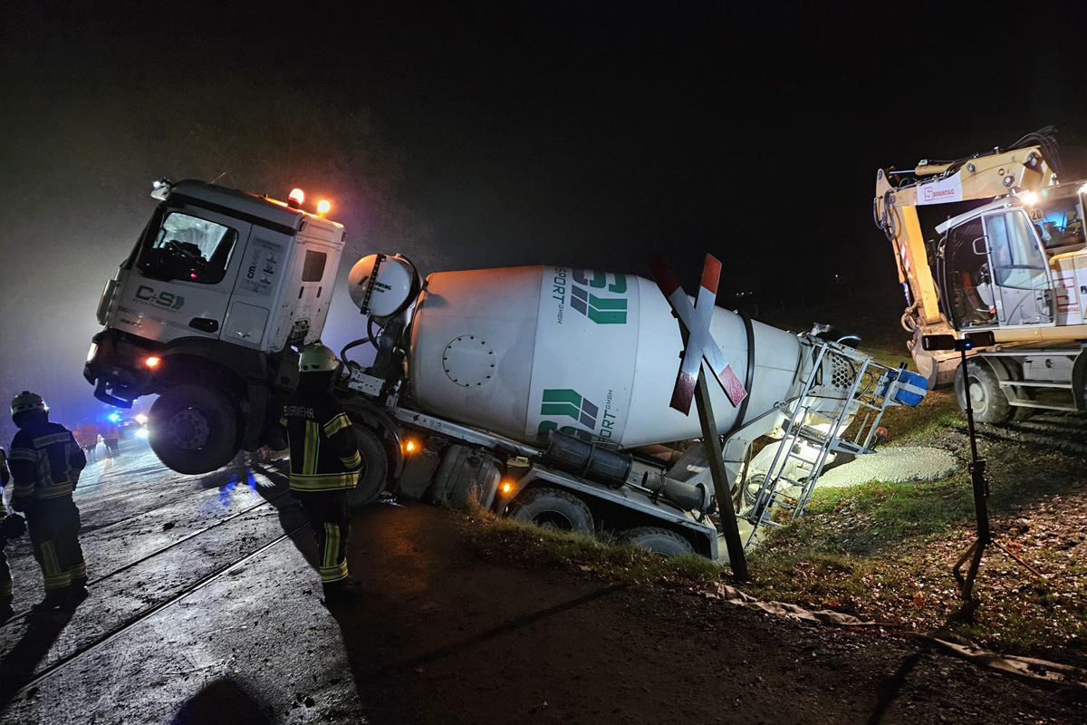 Am frühen Morgen des 27.11.2025 ist in Kutenholz ein Beton-Lkw beim Rangieren in einen Graben gerutscht und in den Gleisbereich der Strecke Buxtehude–Bremervörde geraten. Der Zugverkehr wurde eingestellt, mehrere Kubikmeter Frischbeton liefen aus. Der Fahrer blieb unverletzt.