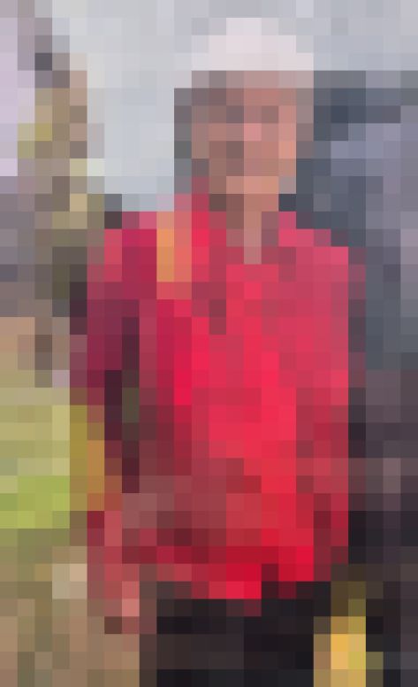 Frau Och ist ca. 165 cm groß, schlank, hat kurze graue Haare, trägt eine Brille, eine rote Jacke und eine schwarze Hose.