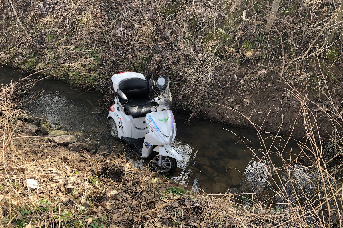 Sie lag unter einem dreirädrigen E-Kleinkraftrad eingeklemmt, war aber noch ansprechbar. Unter Einsatz von Schlingen und Seilen gelang es den Polizisten, den verunfallten Mann aus dem eiskalten Bach zu ziehen. Eine namentlich nicht bekannte Joggerin half kurzerhand bei der Rettung.
