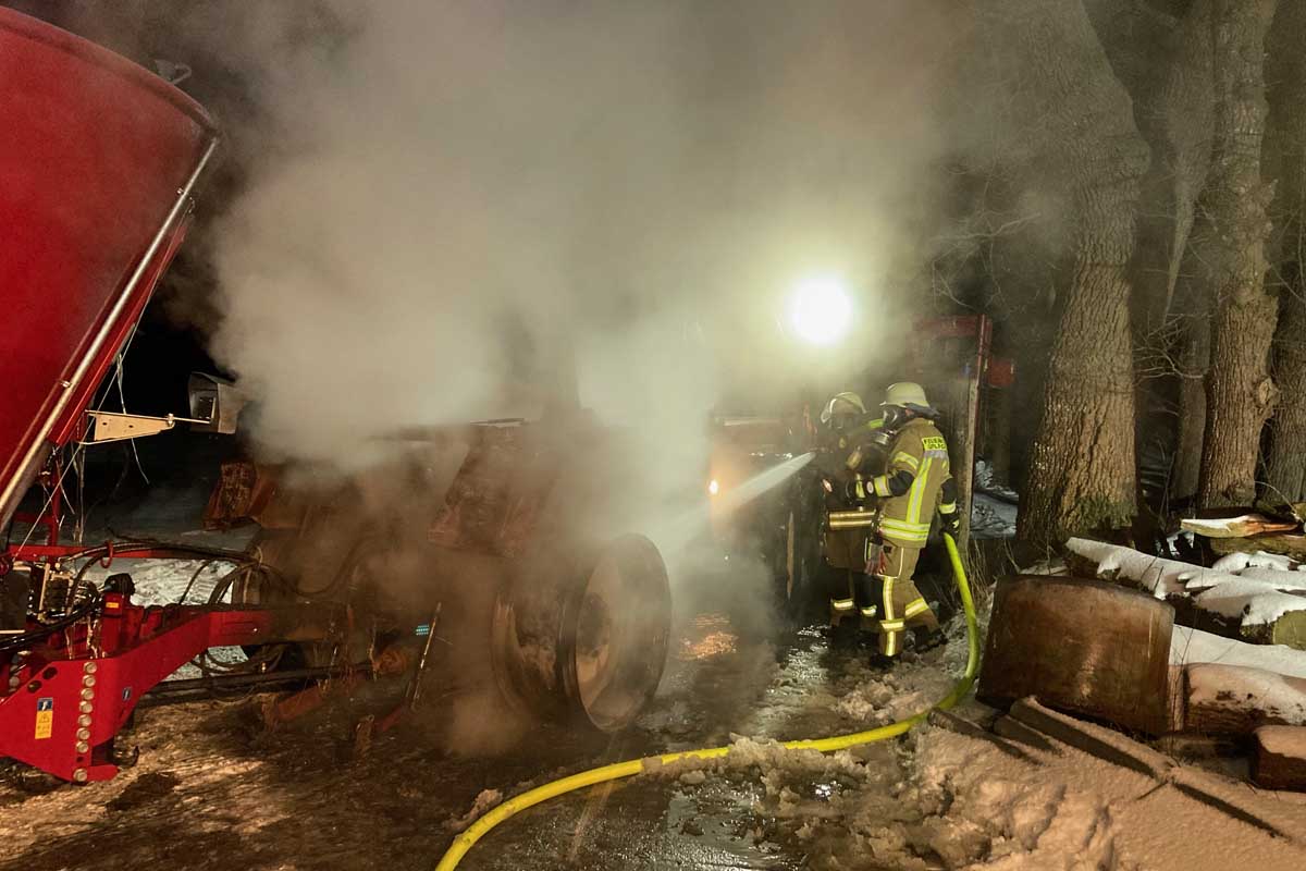 Um ein ausdehnen des Feuers zu verhindern wurde sofort ein Löschangriff gestartet und der Traktor dann aus dem Stall gezogen. Die Nachlöscharbeiten am Traktor fanden dann im Freien statt.