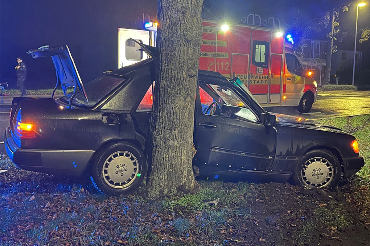 Ein 19-jähriger Autofahrer aus Lippstadt kam aus bislang ungeklärter Ursache mit einem Mercedes nach rechts von der Fahrbahn ab und prallte gegen einen Baum.