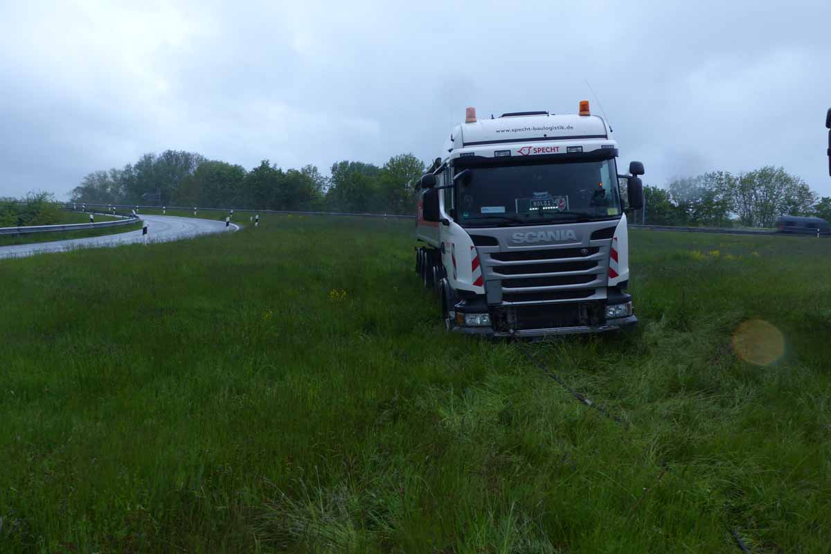 Im Abfahrtsbereich kam gestern das Gespann jedoch nach links von der Fahrbahn ab und im Sichtdreieck der Anschlussstelle zum Stehen.