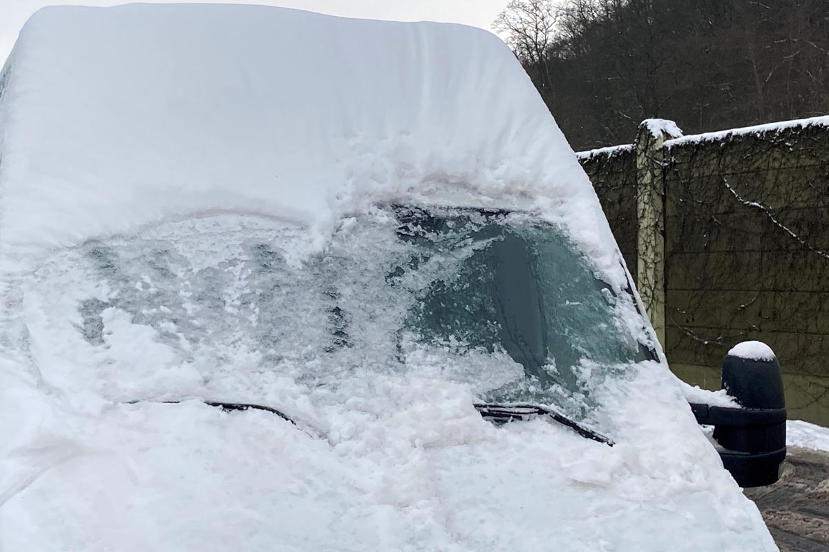 Etliche der Brummifahrer mussten mit einer Steighilfe aufs Dach und vor der Weiterfahrt Hand anlegen. "Insbesondere das Eis auf den Dächern kann sehr gefährlich werden. Es löst sich, rutscht in kleineren oder eben auch größeren Teilen vom Dach und landet bedingt durch die Geschwindigkeit auf dem nachfolgenden Auto. Das kann zu großen Folgeschäden führen.