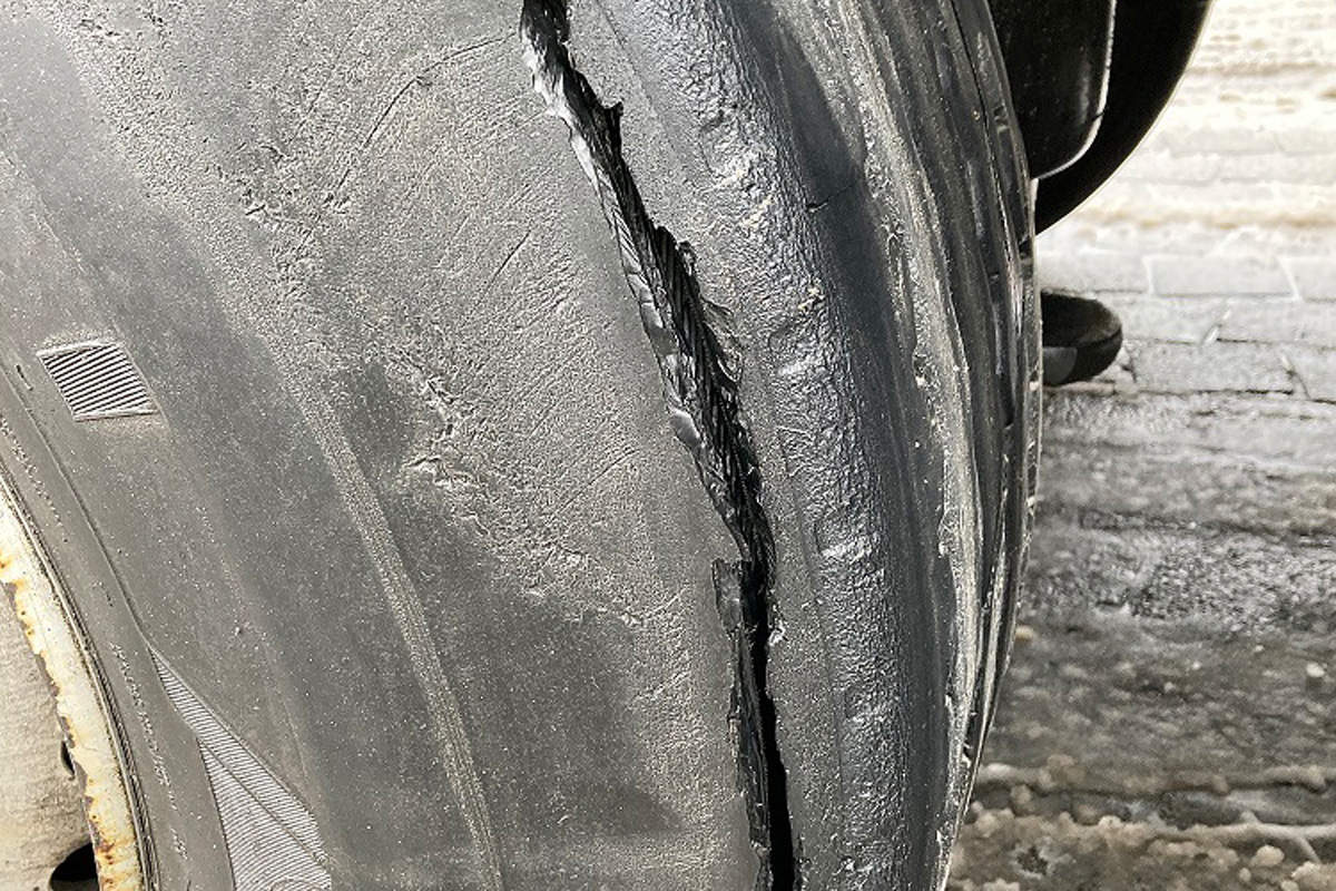 Der Reifen wies einen deutlichen, langen Riss auf. (Bildquelle: Polizeipräsidium Mittelhessen)