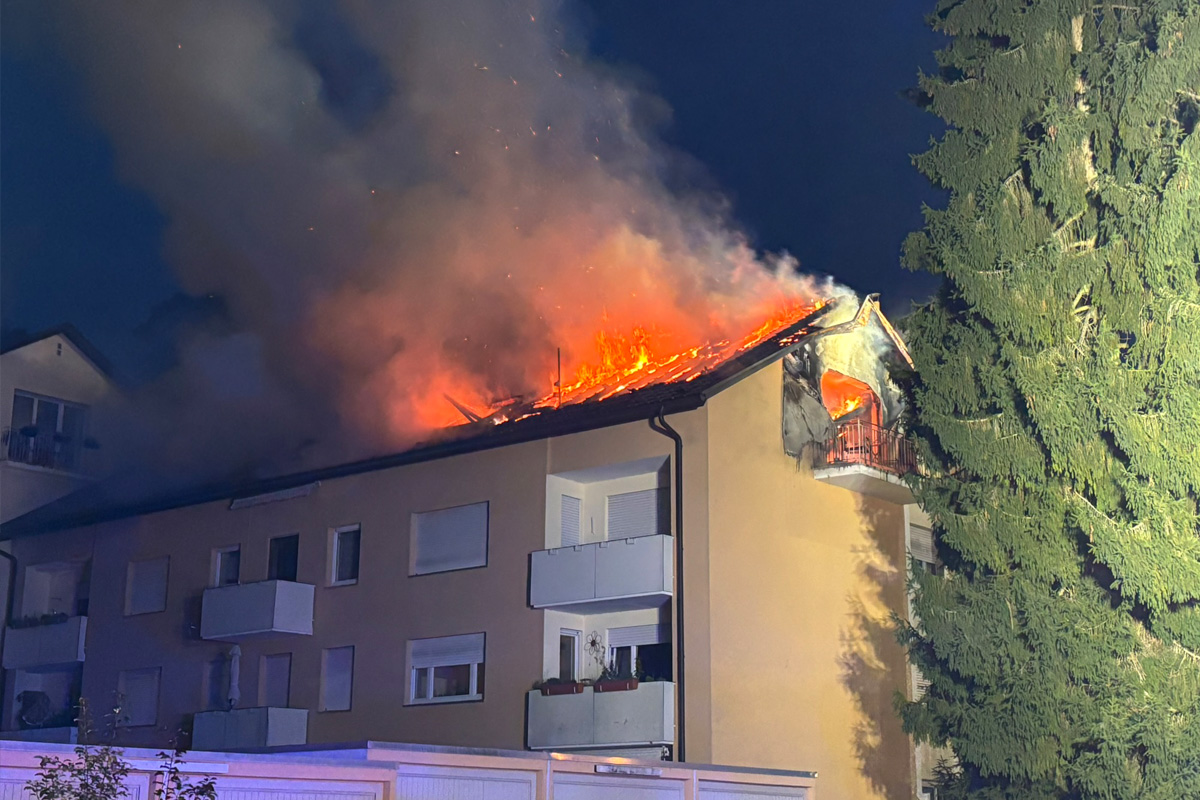 In Meersburg (BW) brannte am Morgen des 23.09.2025 eine Dachgeschosswohnung in einem Mehrfamilienhaus aus. Zwei Bewohner erlitten Rauchgasvergiftungen, ein Feuerwehrmann wurde leicht verletzt. Rund 120 Kräfte waren im Einsatz, der Schaden liegt im sechsstelligen Bereich.