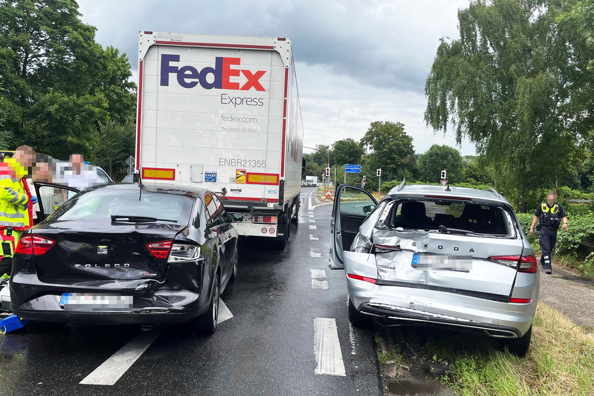 Nach dem derzeitigen Stand der Unfallermittlungen bremste der Lkw-Fahrer jedoch zu spät, wodurch er in das Heck des Skoda Kodaq eines 39-jährigen Erkrathers stieß. Bei dem Versuch, dem Skoda noch auszuweichen, prallte der Lkw zudem auch noch mit dem Opel Zafira eines 47-jährigen Erkrathers zusammen. Zudem wurden bei dem Unfall auch der Seat Toledo einer 38-jährigen Erkratherin sowie der Lkw eines Fahrers aus Litauen beschädigt.