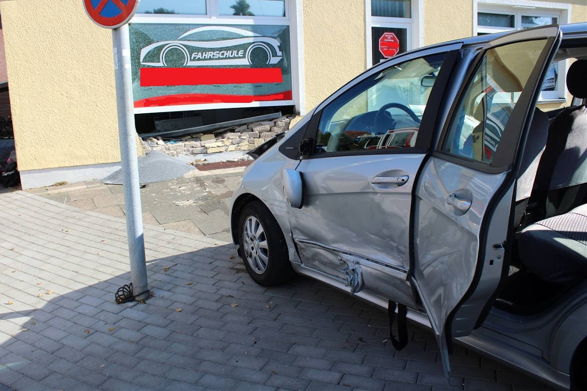 Durch die Wucht der Kollision verlor die 84-Jährige die Kontrolle über ihre A-Klasse und schleuderte in die Fassade der Fahrschule. Hierbei wurde unter anderem eine Scheibe zerstört und die Hauswand schwer beschädigt.