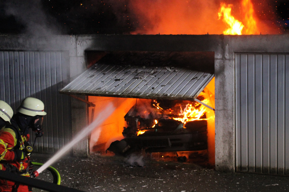 Vor Ort war ein in einer Garage stehender Chrysler aus bisher ungeklärter Ursache in Vollbrand geraten. Einsatzkräfte der Feuerwehr bekämpften die Flammen erfolgreich.