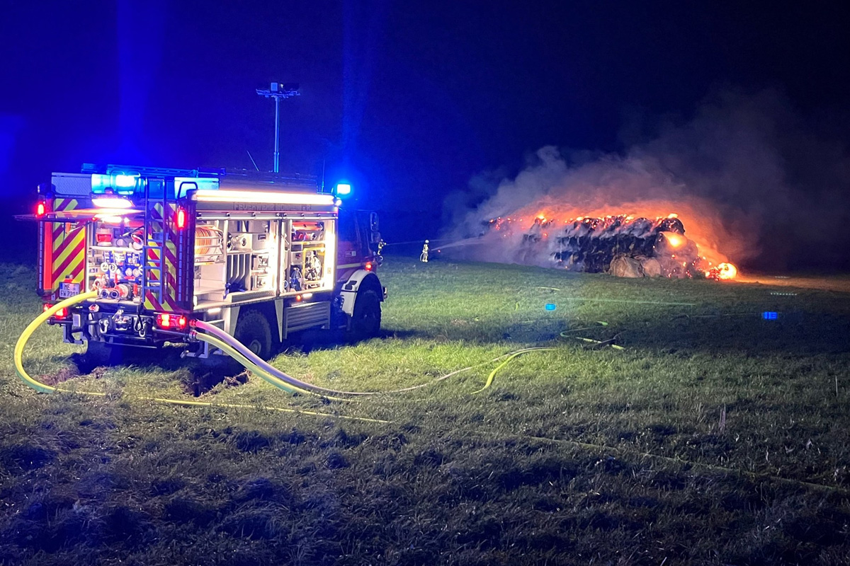 Am Dienstagabend, 04.11.2025, brannten auf einem Reiterhof in Monheim am Rhein (NW) rund 200 Heuballen vollständig ab. Menschen und Tiere kamen nicht zu Schaden. Die Polizei geht von vorsätzlicher Brandstiftung aus und sucht nach einem dunklen VW mit defektem Rücklicht, der in Tatortnähe gesehen wurde.