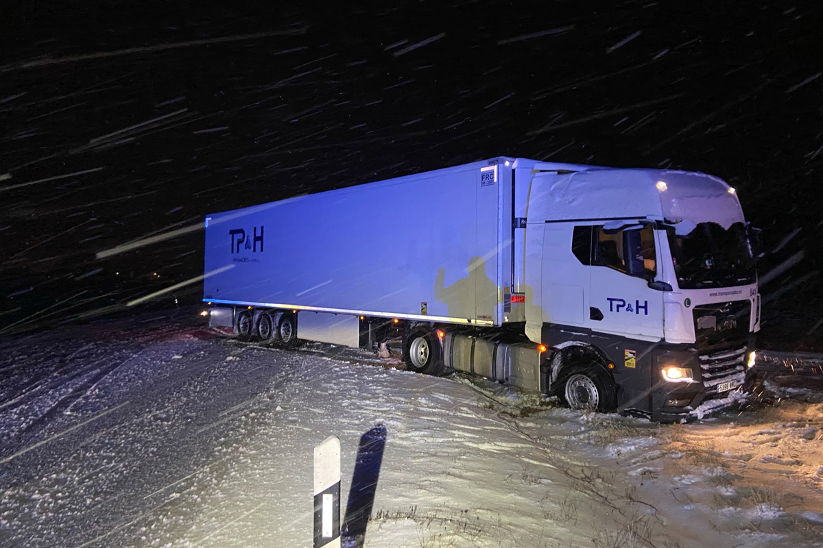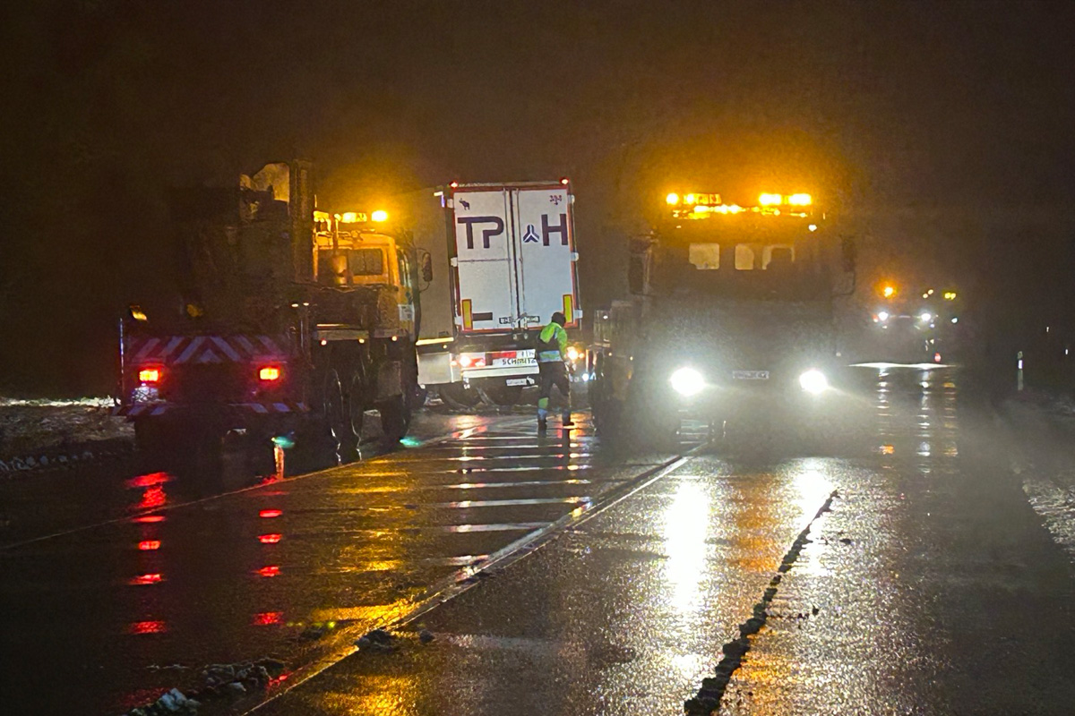 Am 16.02.2026 um 02:36 Uhr wurde mitgeteilt, dass es am 15.02.2026 gegen 21:00 Uhr auf der B327, Höhe Morbach-Hundheim, aufgrund schneeglatter Fahrbahn zu einem Alleinunfall mit einem Sattelschlepper kam.