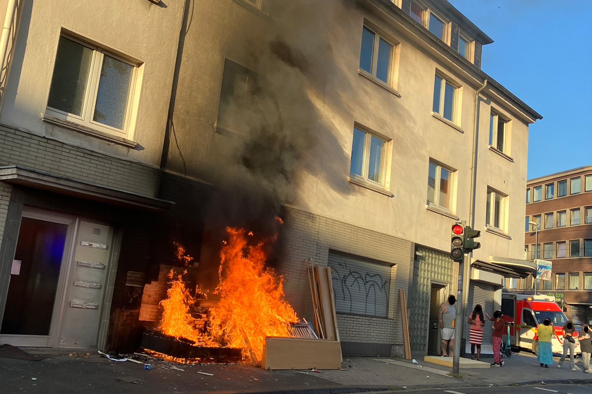 Am 18. August 2025 geriet in Mülheim an der Ruhr Unrat vor einem Wohnhaus in Brand. Das Feuer breitete sich auf eine Erdgeschosswohnung aus. Zwei Wohnungen sind unbewohnbar, verletzt wurde niemand.