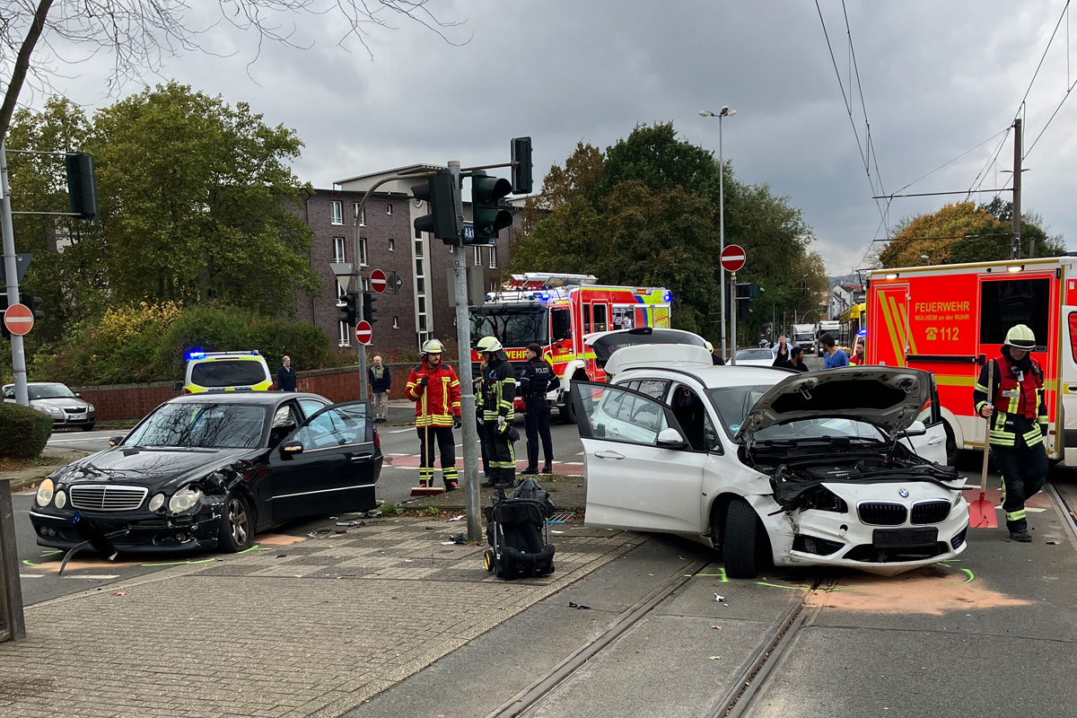 Am Mittwochmittag, 22.10.2025, kollidierten an der Kreuzung Aktienstraße/Mellinghofer Straße in Mülheim an der Ruhr (NW) zwei Autos. Drei Personen wurden dabei verletzt und in Krankenhäuser gebracht. Die Feuerwehr nahm auslaufende Betriebsstoffe auf und sicherte die Unfallstelle ab.